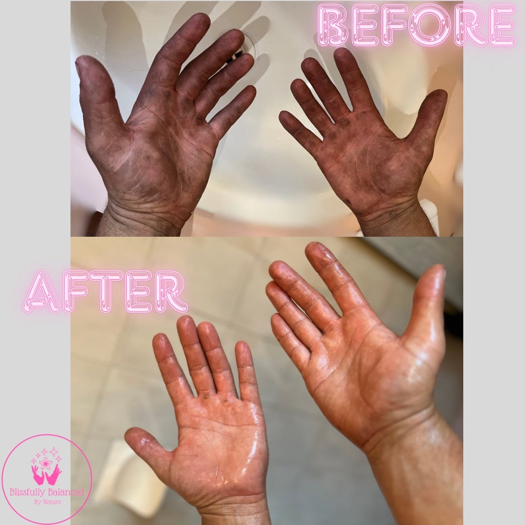 Scoop a small amount of the granules into your wet hands and scrub on the areas that are requiring attention, watching as the dirt runs off and your hands becoming clean and smooth!